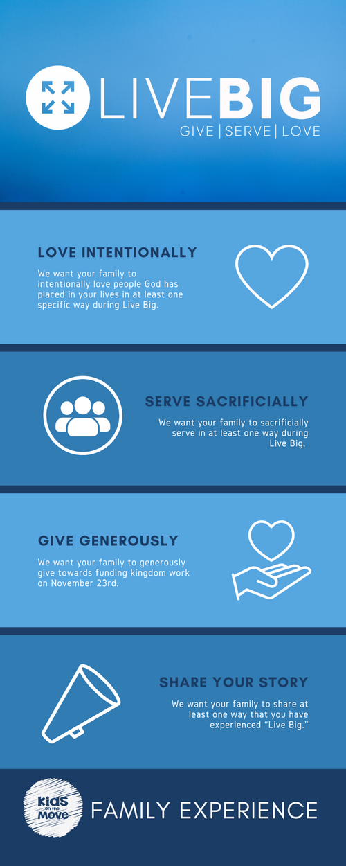 LIVE BIG has been a foundational part of our church from the very beginning of Movement. It is built around our values and our identity as a community. We are committing to 4 things during the month of November: